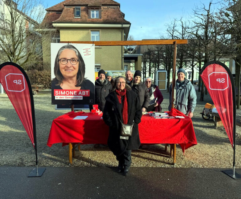 Auf grosses Interesse bei den Besucher:innen am unserem Stand stiessen die Papiertaschentücher, aber auch die Bhaltis mit dem Konterfei unserer Gemeinderatskandidatin Simone Abt.